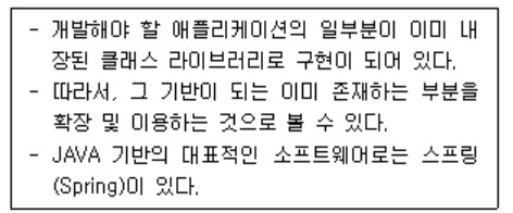 - 설계 관점에 개발 방식을 패턴화시키기 위한 노력의 결과물인 소프트웨어 디자인 패턴을 반제품 소프트웨어 상태로 집적화시킨 것으로 볼 수 있다.
