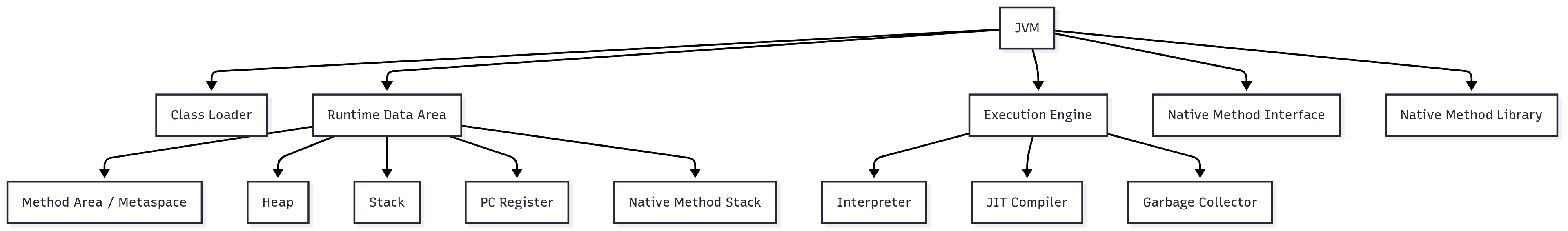 Class Loader .class 파일을 메모리에 로드 Runtime Data Area 실행 시 데이터 저장 영역 (Heap, Stack 등) Execution Engine 바이트코드 실행 (Interpreter, JIT Compiler) Native Method Interface 자바 코드 ↔ 네이티브 라이브러리 연결 Native Method Library C/C++ 등 네이티브 코드 라이브러리