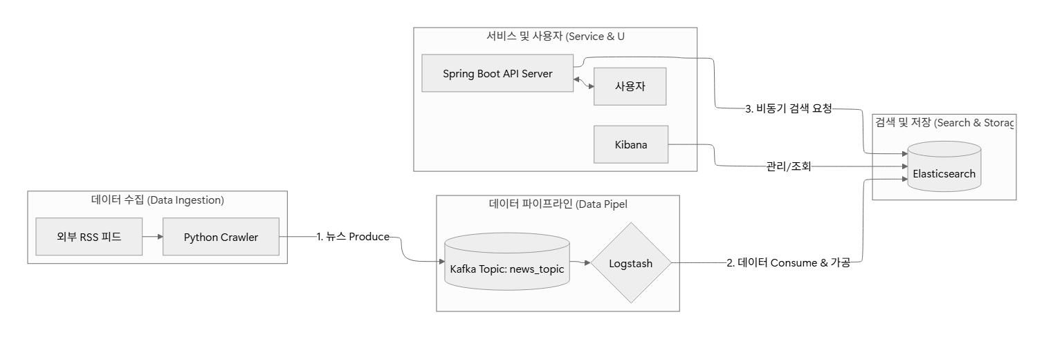 Kafka 기반의 Event-Driven Architecture를 적용하여 뉴스 데이터 수집(Producer)과 색인(Consumer) 프로세스를 분리(Decoupling)한 분산 처리 시스템입니다. Spring WebFlux와 Elasticsearch Async Client를 도입해 전 구간 Non-blocking I/O를 구현하였으며, 이를 통해 단일 인스턴스 내에서 동시 요청 처리량(Throughput)을 극대화하고 시스템의 내결함성(Fault Tolerance)을 확보했습니다.