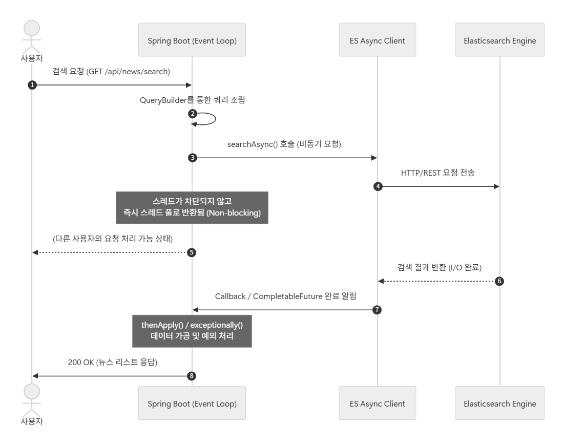 CompletableFuture체이닝을 통해 요청부터 색인 조회까지의 전 과정을 비동기로 설계함.searchNewsAsync호출 시 스레드는 응답을 대기하지 않고 즉시 스레드 풀로 반환되어 다른 HTTP 요청을 즉각 처리함. - 예외 처리: 비동기 호출 연쇄 과정에서 발생하는 예외를